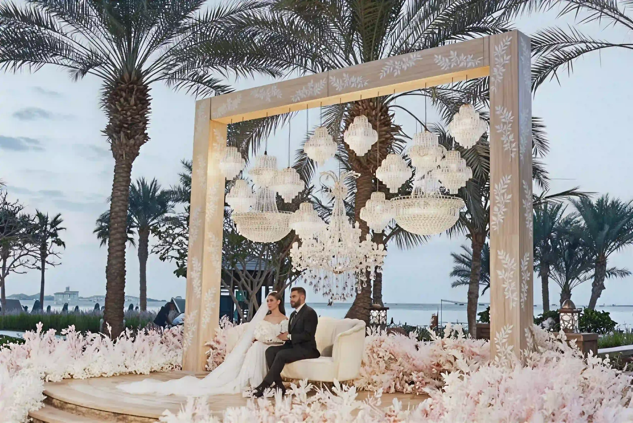 نستخدم أقواس الزهور، والستائر البيضاء، والممرات الخشبية، والفوانيس، وأضواء الإضاءة الخافتة (Fairy Lights) لخلق إطلالة ناعمة وجميلة. ويضيف منظر المحيط جمالًا طبيعيًا إلى حفل زفافك