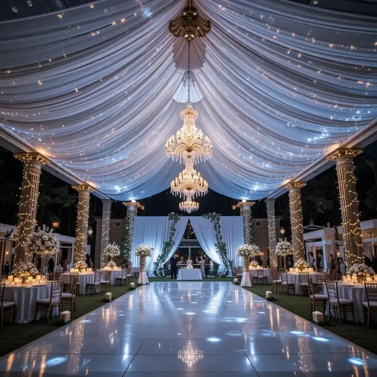 A glamorous wedding is a luxury wedding style with elegant décor, premium lighting, and a stylish setup.